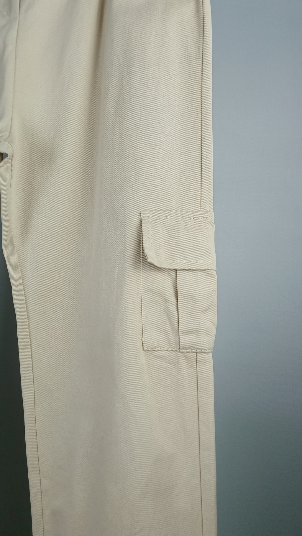 Calça bege cargo M 40, com caimento mais solto na perna, possui bolsos laterais e na perna. Fechamento em zíper e botão. Possui passador para cinto para melhor ajuste.